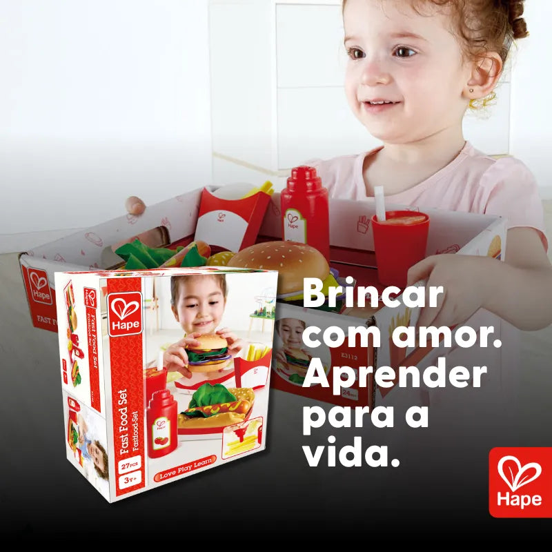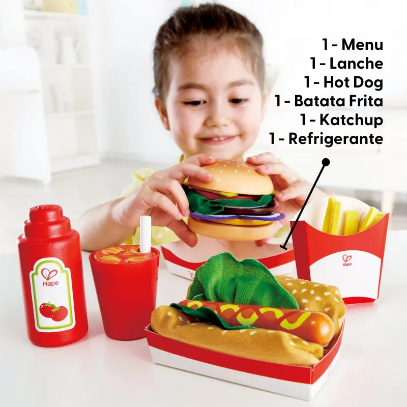 Este divertido Kit de Jantar Americano da Hape inclui um cardápio e os itens essenciais para o seu próprio fast food: uma hambúrguer realista, um cachorro-quente (hot dog), batatas fritas e um copo de refrigerante (cola).