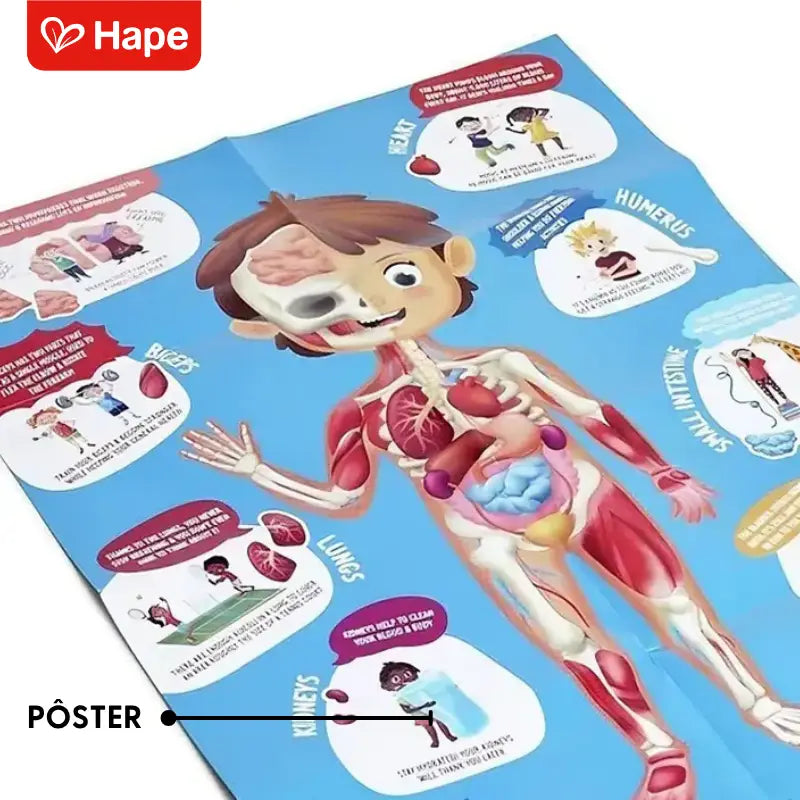 - Pôster Educativo Dupla Face: Inclui um pôster completo com informações essenciais sobre o corpo humano para aprofundar o conhecimento.