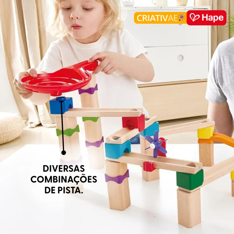 Muitos brinquedos de pista são "fechados", sem espaço para a criança criar. A Pista de Corrida DIY da HAPE, trazida pela Criativae, é um convite à engenharia infantil. Ela quebra a monotonia ao exigir planejamento real para que a bolinha passe pelo funil e atinja o objetivo final. É o equilíbrio perfeito entre a diversão de alta velocidade e o aprendizado sobre gravidade e lógica.